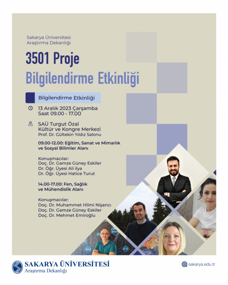 On Wednesday, December 13th, from 09.00 to 17.00, the Dean of Research will organize the "3501 Project Information Event" at SAU Turgut Özal Culture and Congress Center in Prof. Gültekin Yıldız Hall.