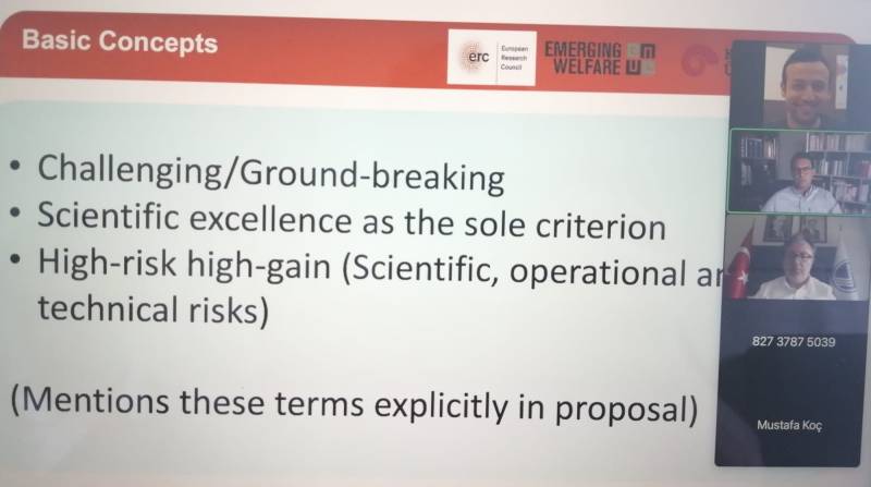 Araştırma Dekanlığı tarafından üçüncüsü çevrimiçi olarak düzenlenen ‘ERC Projeleri Bilgilendirme Etkinliği’ne Koç Üniversitesi Sosyoloji Bölümü Öğretim Üyesi Doç. Dr. Erdem Yörük katıldı. 2017-2021 yılları arasında starting grant (başlangıç hibesi) altında ‘Refah Devletinin Yeni Siyaseti: Yükselen Ekonomilerde Yeni Bir Refah Devleti Rejimine Doğru’ adlı projesini yürüten ve proof of concept (kavram kanıtı) hibesi çerçevesinde 2022-2024 yılları arasında ‘Politus: Yapay Zeka Temelli Veri Platformu’ adlı projesini sürdüren Dr. Yörük, ERC programına ve yürüttüğü projesine ilişkin tecrübelerini üniversitemizin öğretim üyeleri ile paylaştı.
