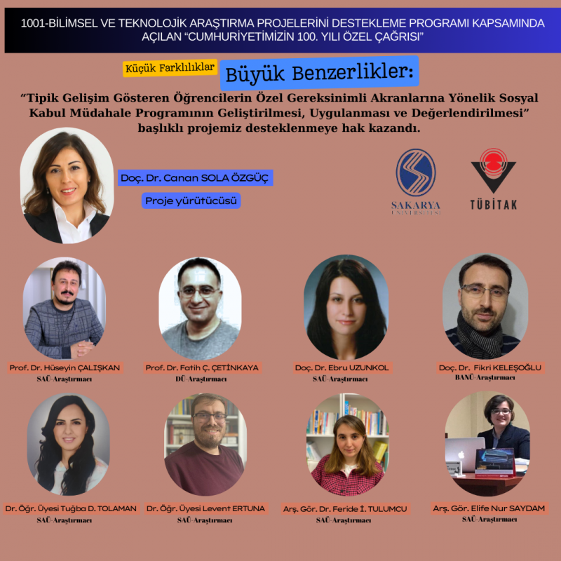 TÜBİTAK’ın en prestijli çağrısı olan ve Cumhuriyetimizin 100. Yılına özel olarak açılan “TÜBİTAK 1001 – Cumhuriyetimizin 100. Yılı Özel Çağrısı” kapsamında Sakarya Üniversitesi Eğitim Fakültesi Özel Eğitim Bölümü Öğretim Üyesi Doç. Dr. Canan Sola Özgüç’ün yürütücülüğünü yaptığı “Küçük Farklılıklar Büyük Benzerlikler: Tipik Gelişim Gösteren Öğrencilerin Özel Gereksinimli Akranlarına Yönelik Sosyal Kabul Müdahale Programının Geliştirilmesi, Uygulanması ve Değerlendirilmesi” başlıklı proje desteklenmeye hak kazandı.