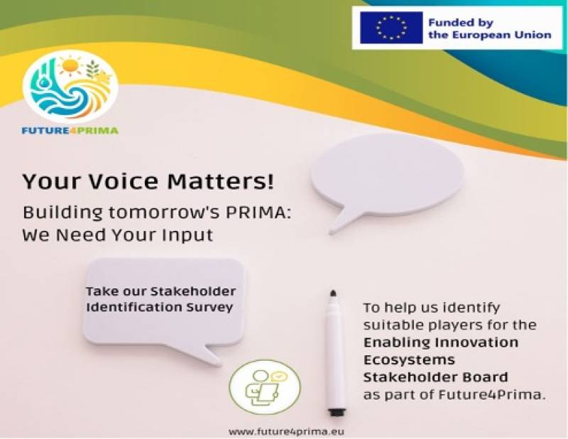 FUTURE4PRIMA projesi, PRIMA için kapsamlı bir vizyonu ileriye taşımak amacıyla bir Paydaş Kurulu kurmayı hedeflemektedir. Bu kurul, su, enerji, gıda ve ekosistemler (WEFE) gibi kritik alanlarda Ar-Ge proje sonuçlarının benimsenmesini teşvik etmeye odaklanacaktır. PRIMA, su kıtlığı, gıda güvenliği ve sürdürülebilir tarım gibi acil sorunların ele alınması için işbirlikçi araştırma ve inovasyonu teşvik etmede önemli bir rol oynamıştır. Şimdi, güçlü bir inovasyon ekosistemi yaratarak gelecekteki ortaklığın etkisini artırmak için bir sonraki adımı atmayı hedeflemektedir. Söz konusu Paydaş Kurulu için ideal adayların belirlenmesine yardımcı olmak üzere tüm Akdeniz ülkelerinin araştırmacılarının ilgili ankete katılması beklenmektedir.
